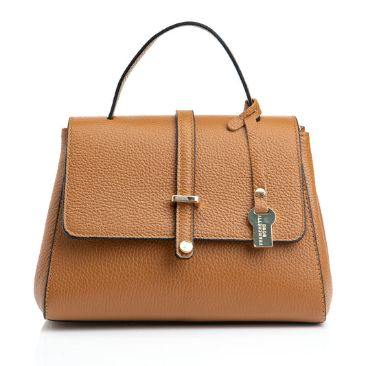 FB217 Valentina Tan Classic Bag With Flapover, Gold Clasp & Two Straps- Dollaro Leather