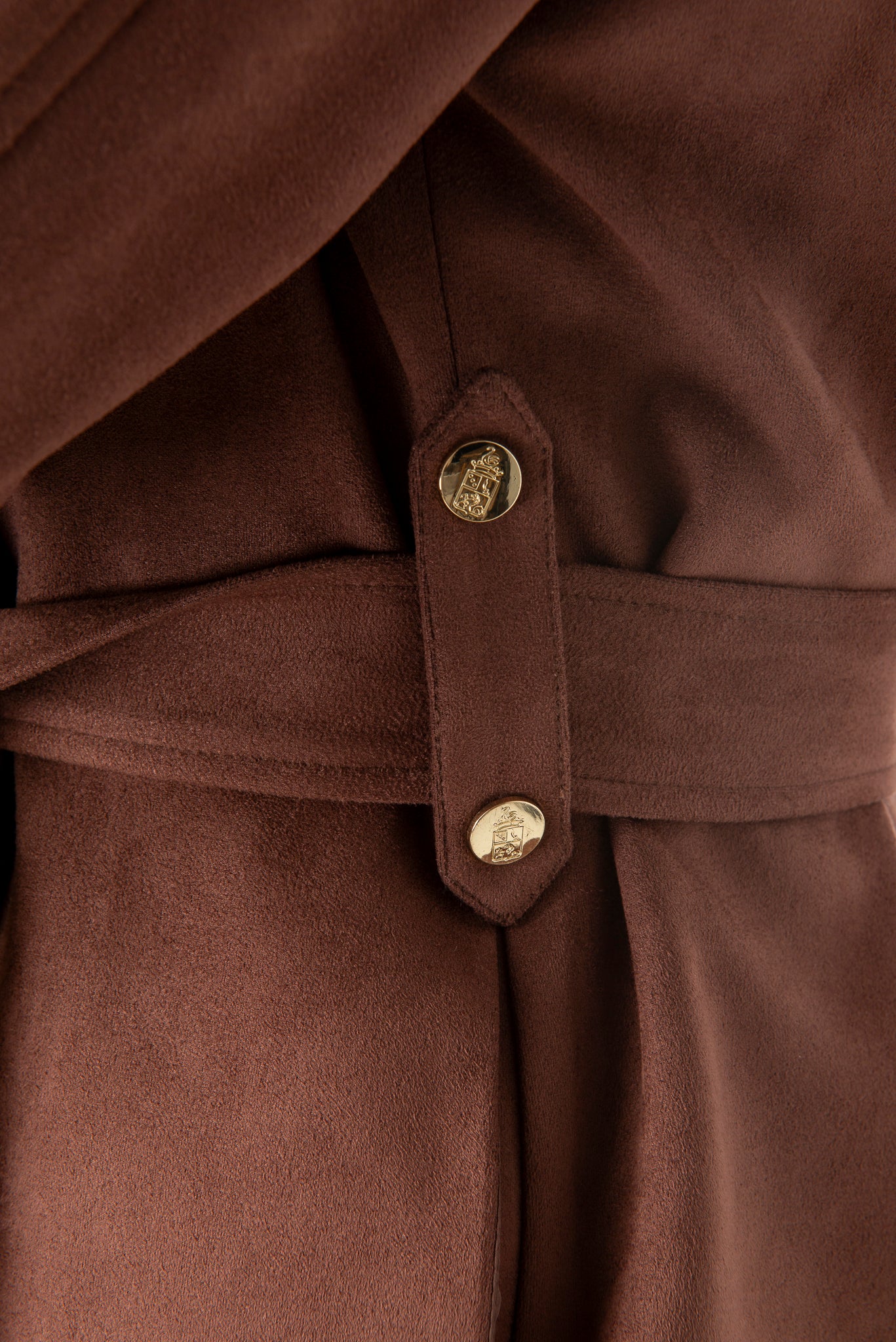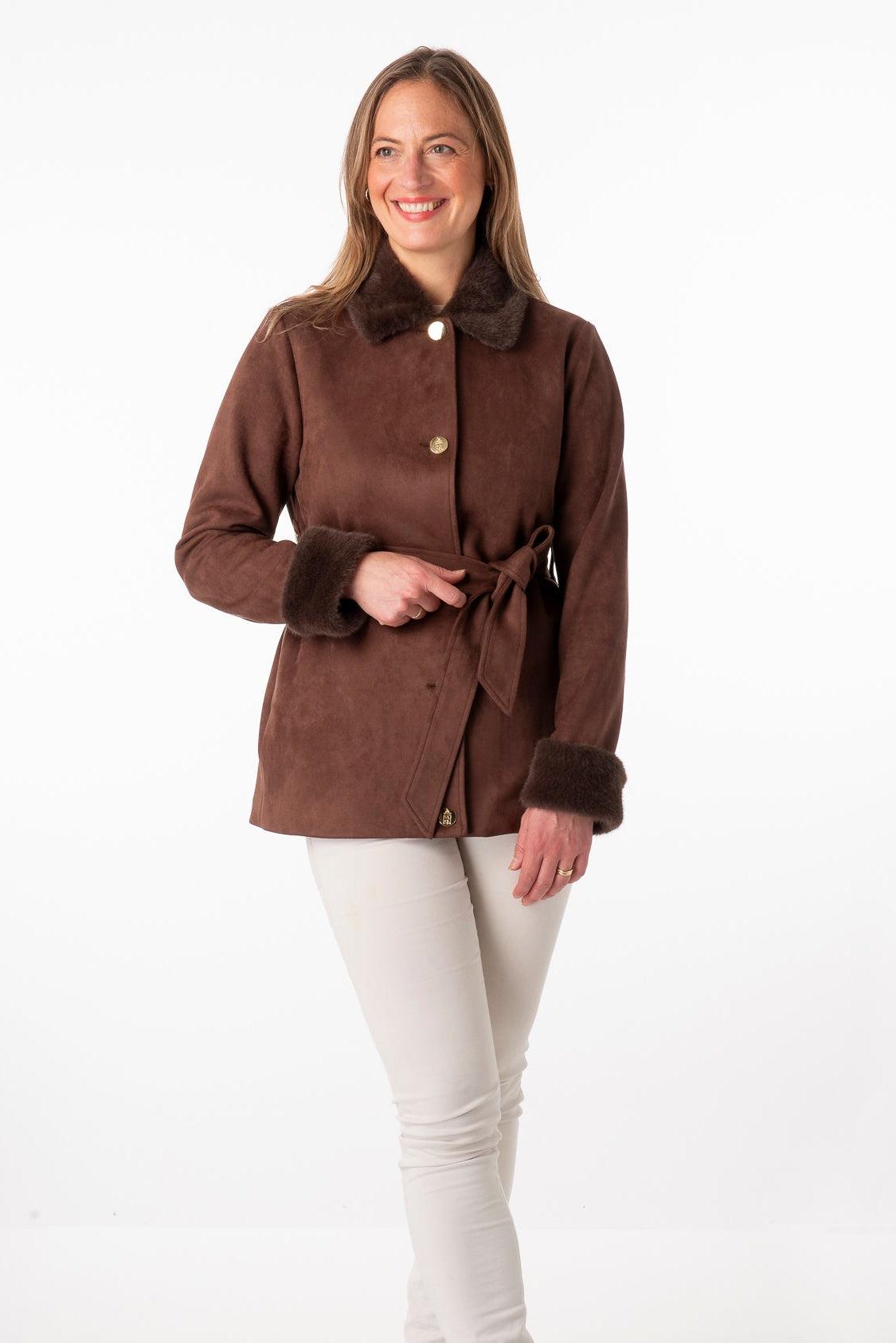 Medium length suedette coat with faux fur collar and cuff - Franchetti Bond logo buttons - Franchetti Bond heat embossed logo