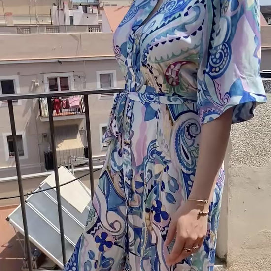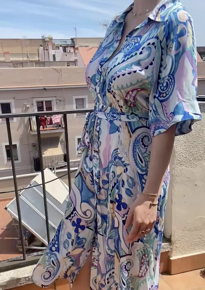 Blue Swirl patterned shirt dress with shell buttons, 100% viscose. Throw on this dress and look put together in a second! The belt tie accentuates the waist giving you shape while being super comfortable.