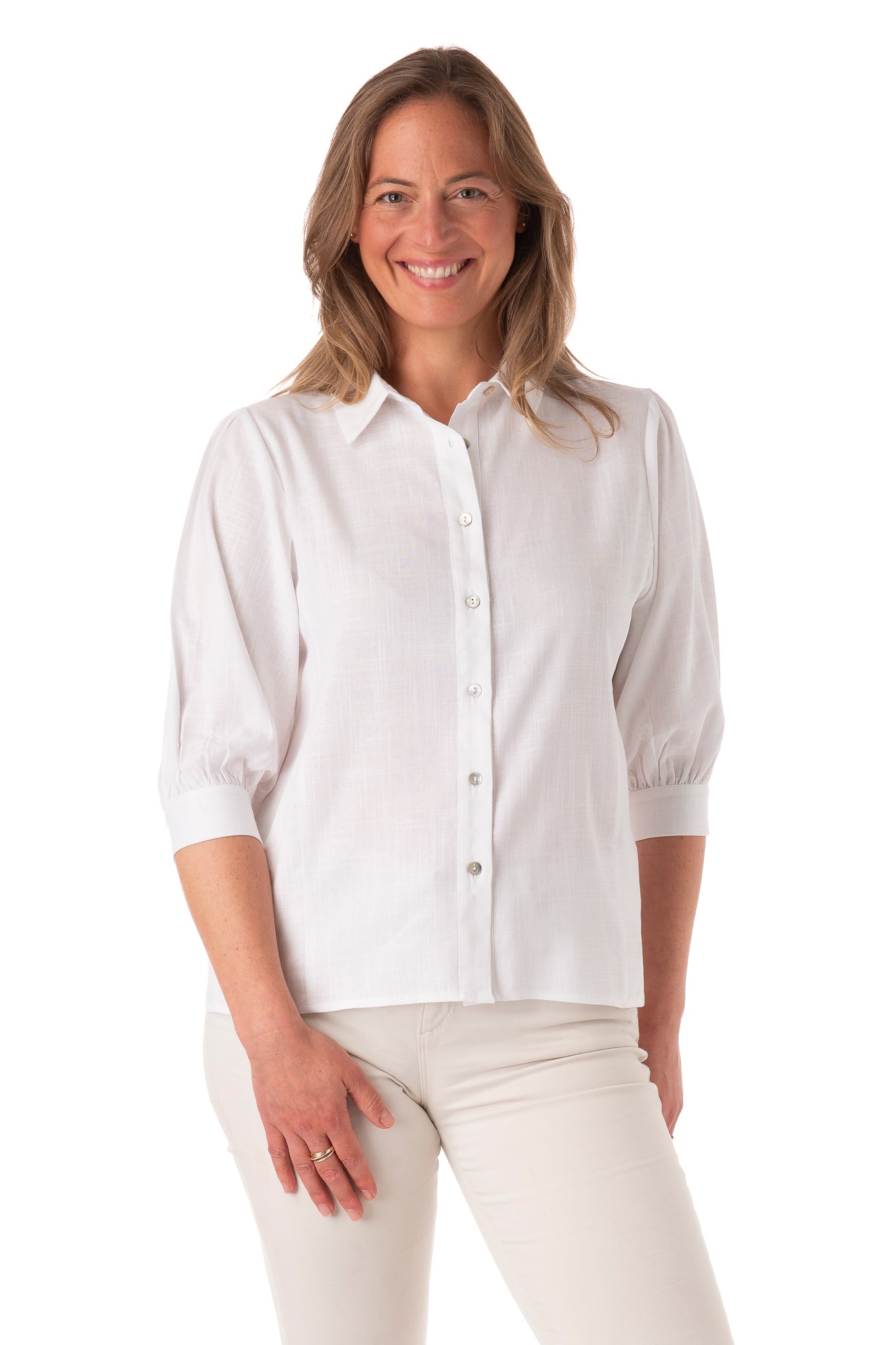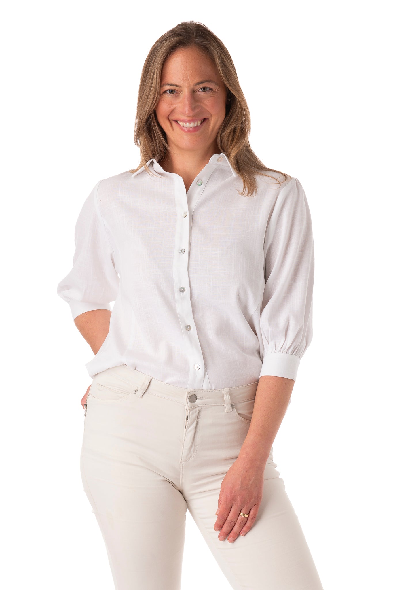Effortlessly chic, this White blouse features a relaxed silhouette, soft drape, and elegant half sleeves with buttoned cuffs. Perfect for refined everyday style, it blends timeless tailoring with modern comfort.