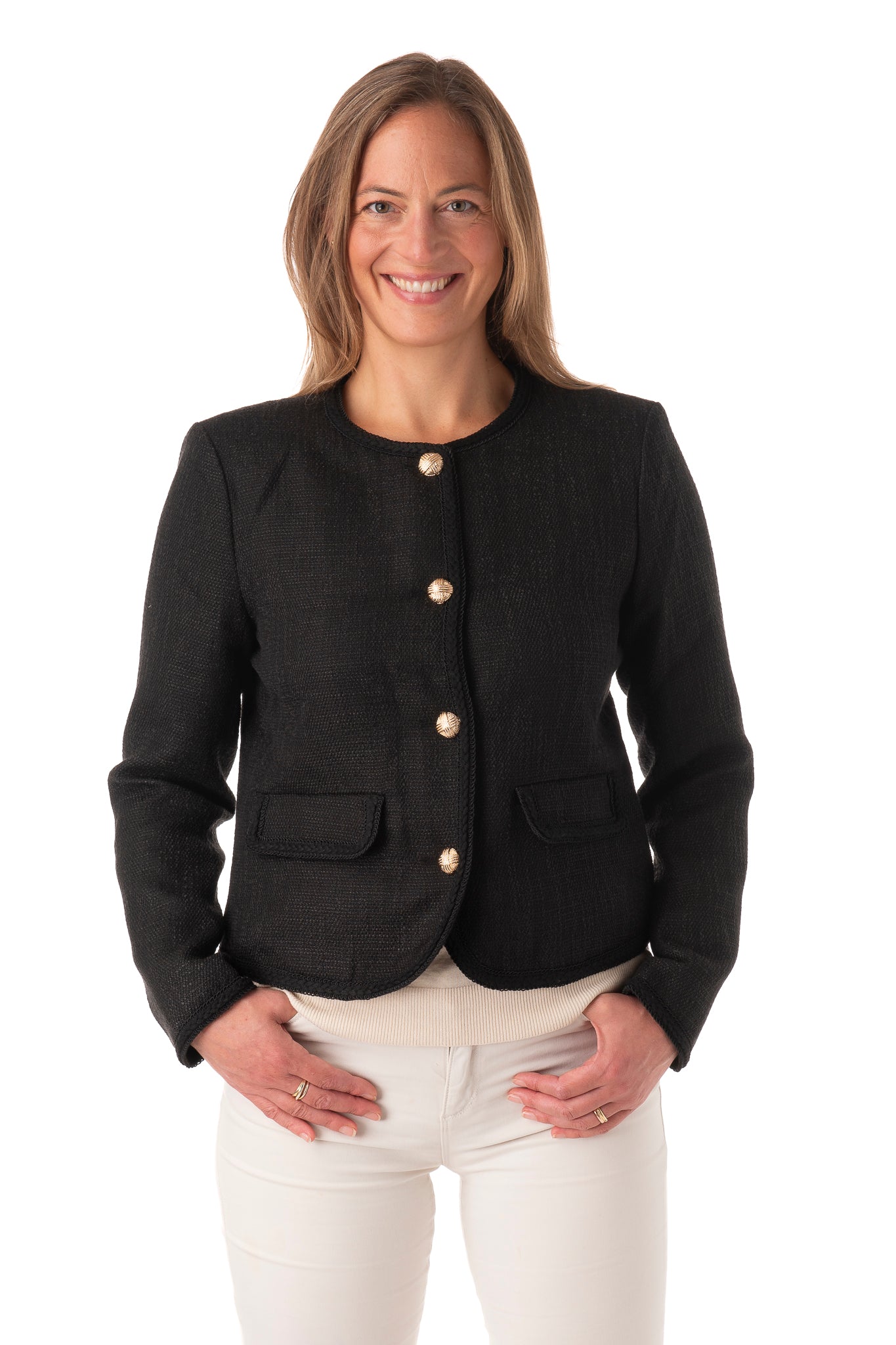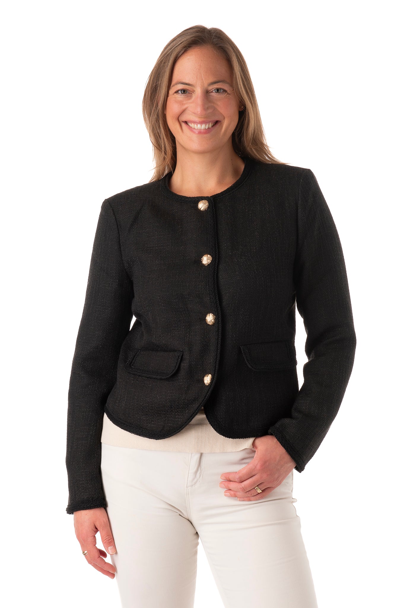 Black, textured weave cotton short jacket with gold buttons. We have taken extra care with the finishings, the binding has beautiful ornate detailing and the buttons have a subtle texture to elevate the look. This jacket is the definition of sophistication!