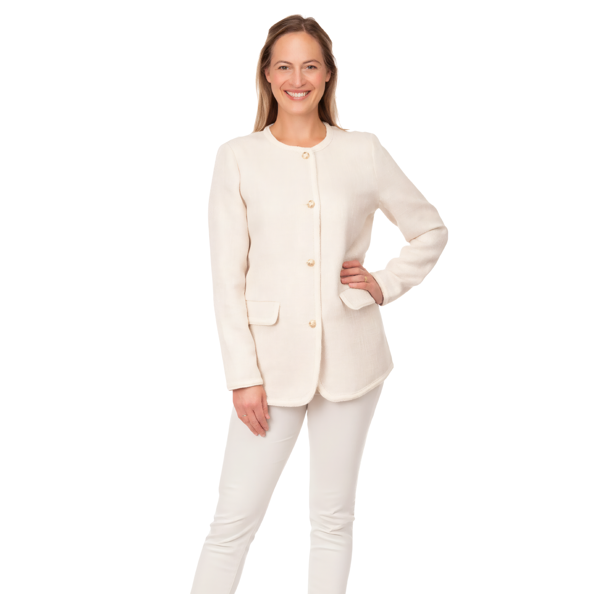 Off White, textured weave cotton long jacket with gold buttons. We have taken extra care with the finishings, the binding has beautiful ornate detailing and the buttons have a subtle texture to elevate the look. This jacket is the definition of sophistication!