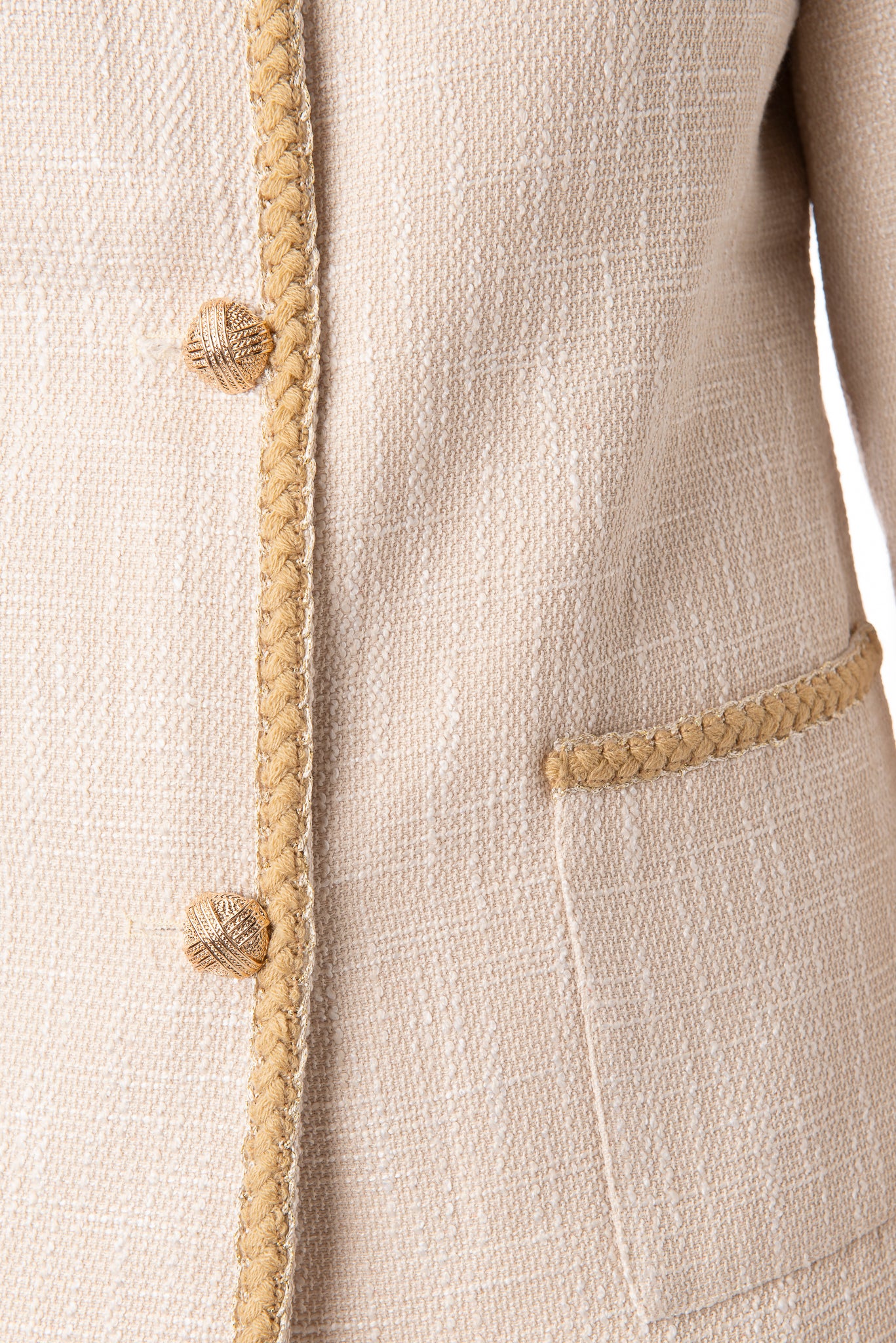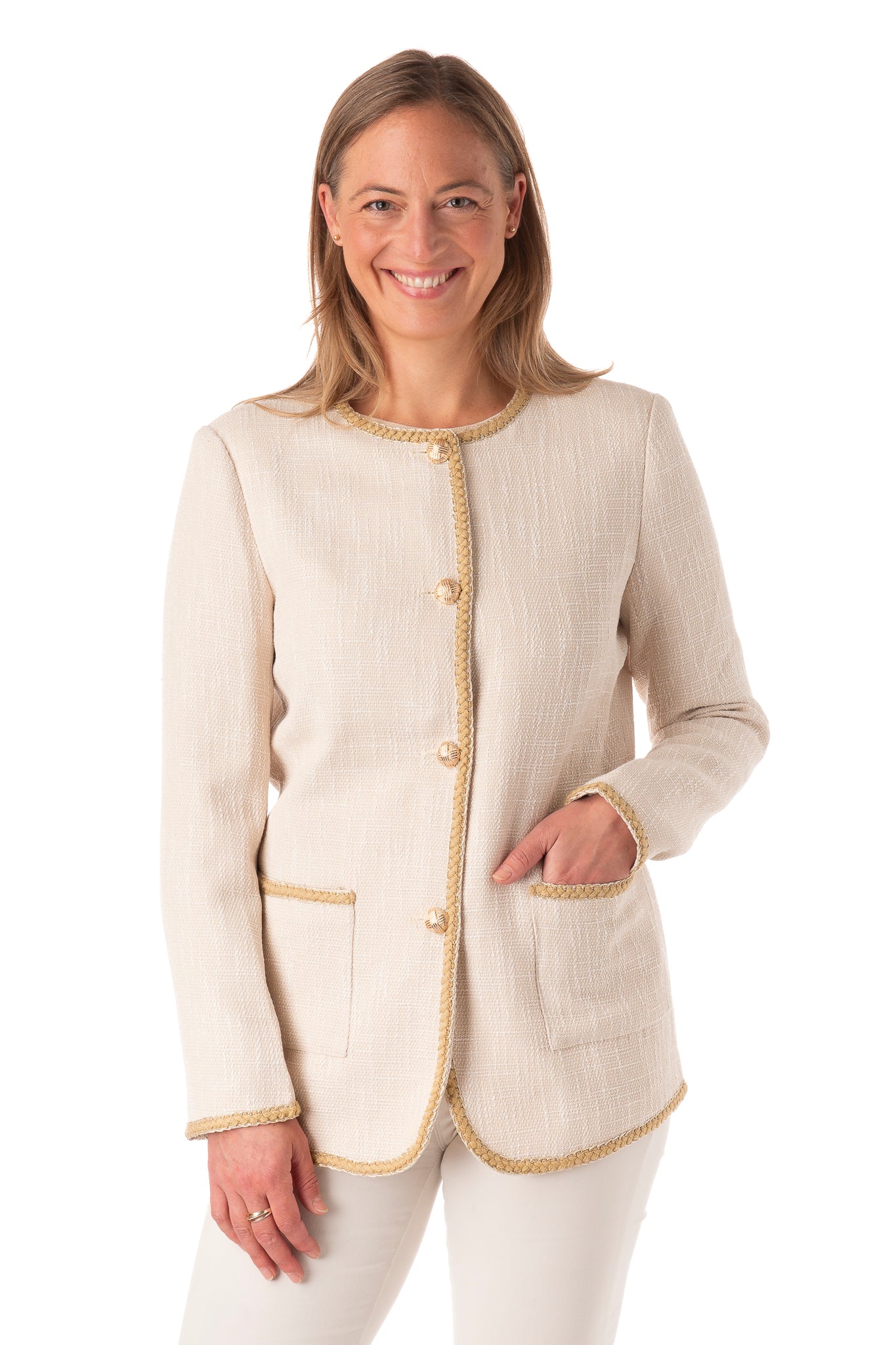 Textured weave long jacket with gold buttons